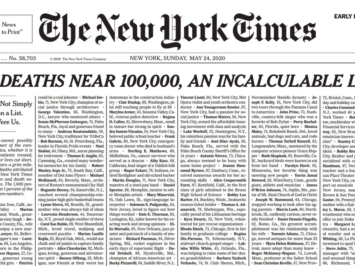 New York Times Marks Grim Covid 19 Milestone With 1 000 Obituaries