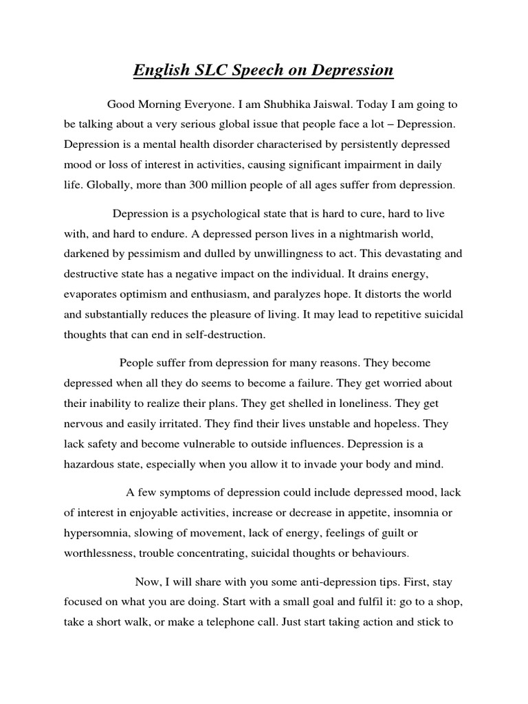 Speech on Depression It is hard to live with and tough to endure. The physical signs of depression can be painfully obvious but do they show up in your speech and choice of words. To inform the audience about Depression.