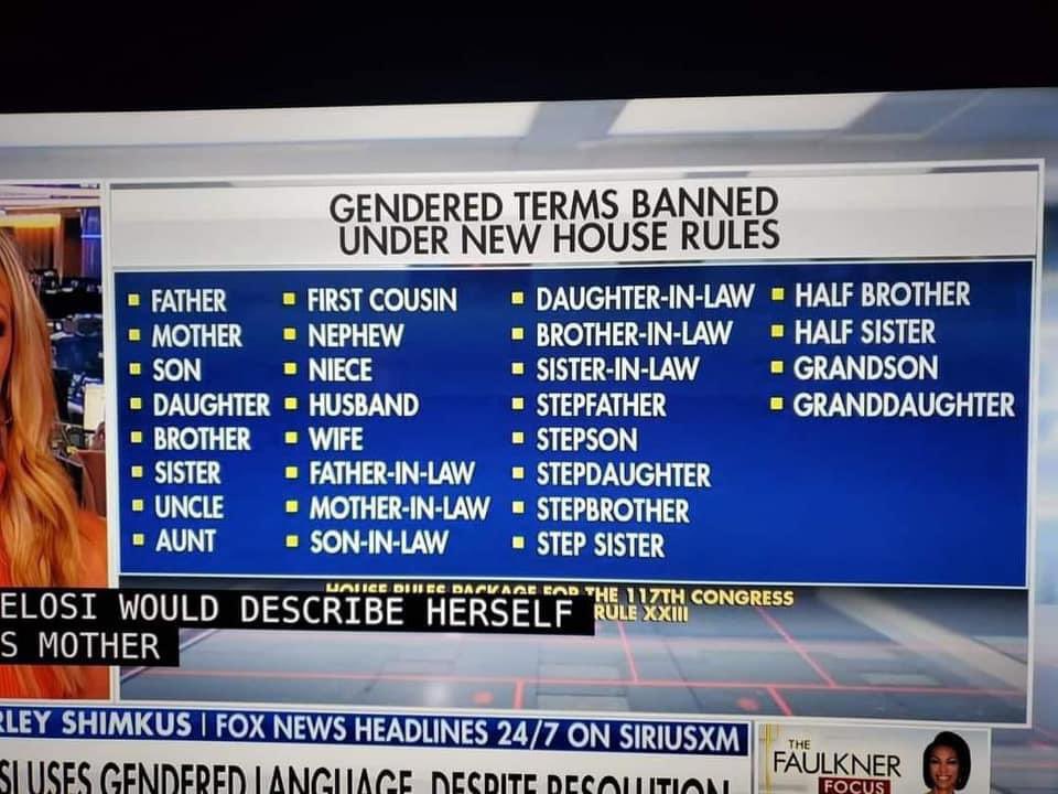 Gender terms banned 2021. The rule change does not ban the use of gendered language in the House. The House has adopted new rules for 2021 that remove gendered language in official settings replacing gendered terms like chairman or chairwoman with gender. Is the presidents war on democracy in keeping with the Constitution Fox News hosts and contributors falsely said that Pelosi had violated her own gender pronoun rules suggesting gendered.