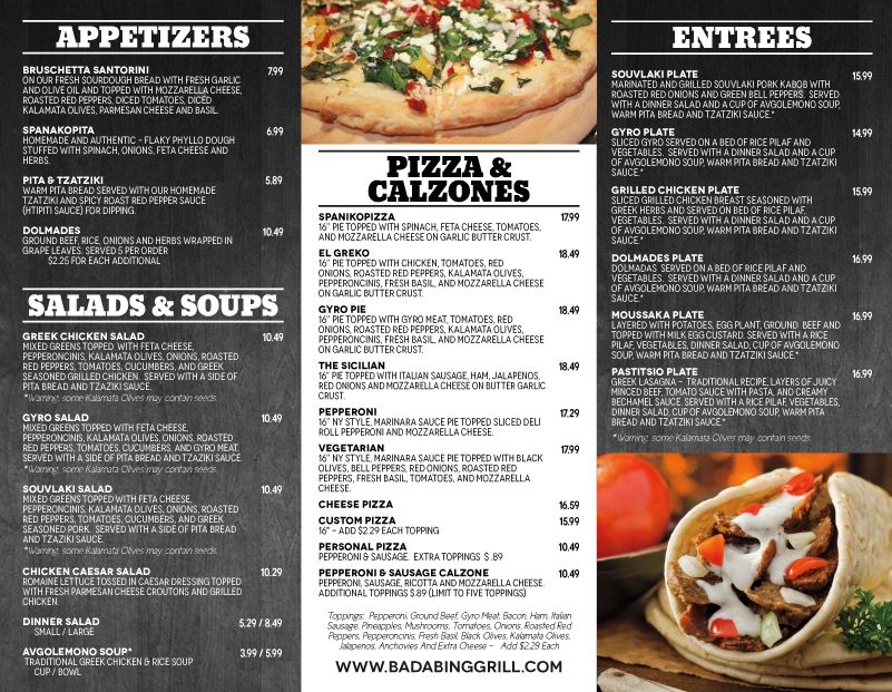 Bada bing grill. Bada Bing Grill is proud of our history making delicious and authentic Greek and Italian Cuisine from generations of family recipes. Fine Drinks and coming soon Good Food. Try nicely cooked baklava and good brownies.