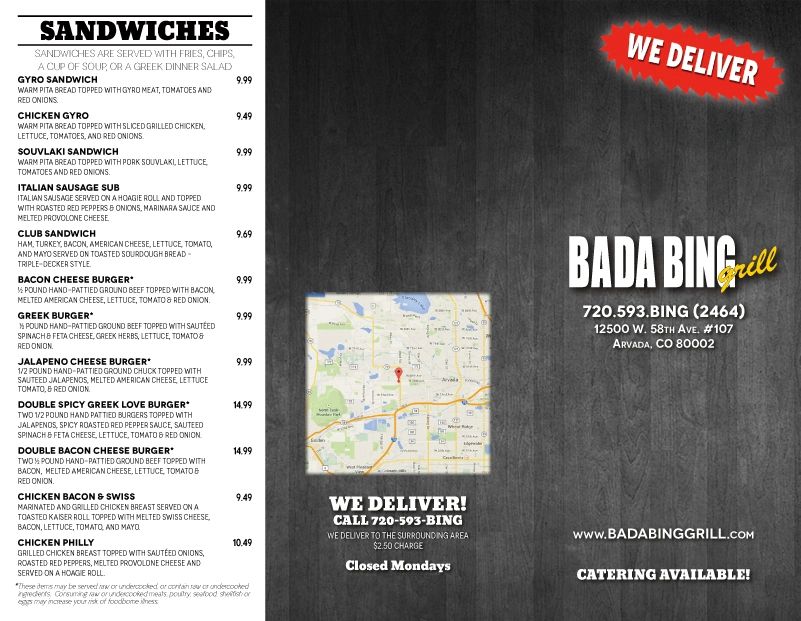 Bada Bing Grill. View Bada Bing Grill menu located at 12500 W 58th Ave Unit 107 Arvada CO 80002. View Bada Bing Grills April 2021 deals and menus.